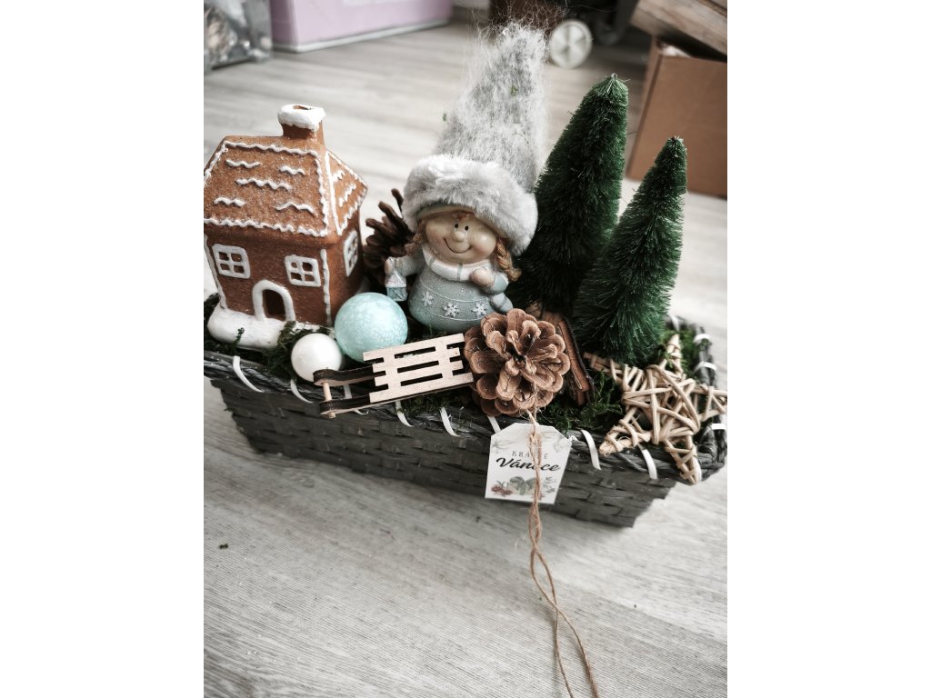 Vánoční truhlík s panenkou stromečky a domeckem .