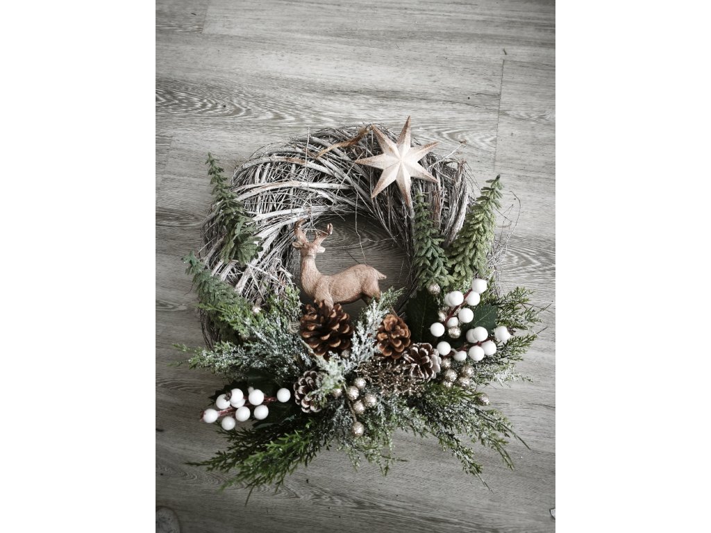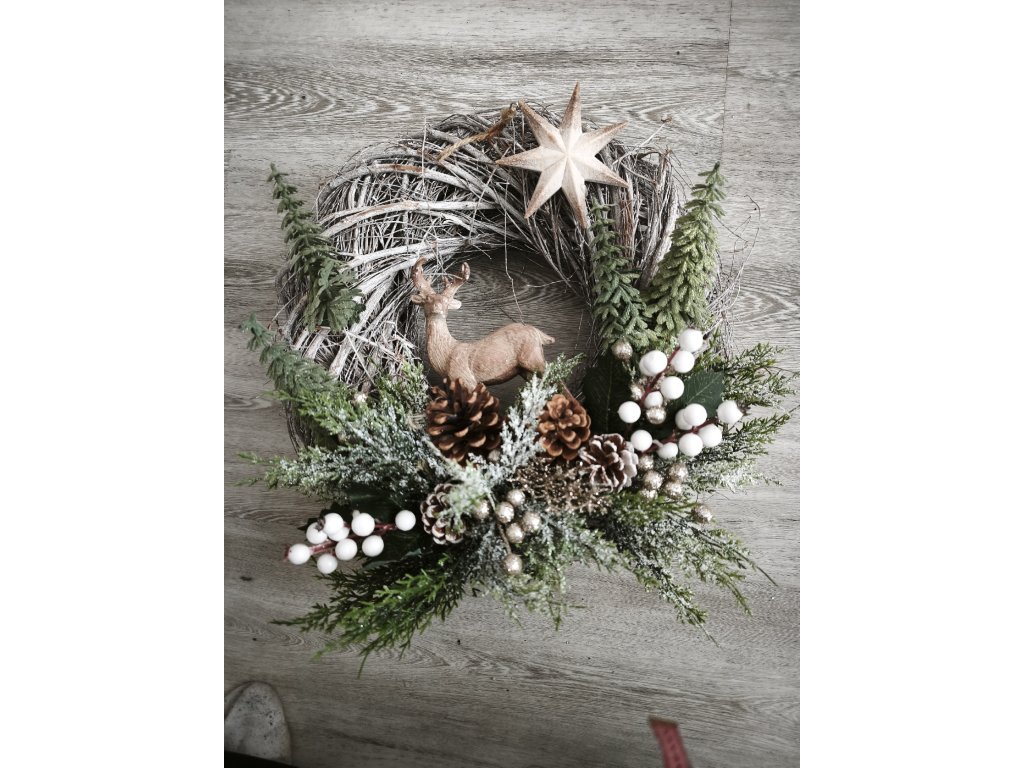Věnec trvalý se stromečky jelenem a umělými dekoracemi na Váš dům či vrata